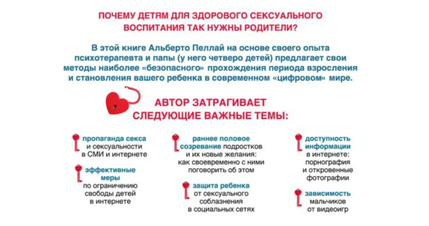 Анна Левинская, педагог и многодетная мать, в своей книге предлагает комплексный подход к половому воспитанию детей от рождения до совершеннолетия. Автор дает практические советы родителям, как говорить с детьми о теле, отношениях и сексуальности на разных этапах их развития. «Важно не упускать момент и начинать разговоры о теле и отношениях с самого раннего возраста», – советует Левинская. Книга помогает родителям создать атмосферу доверия и открытости в семье, чтобы ребенок не стеснялся обращаться к ним с любыми вопросами. Автор делится личным опытом и дает конкретные рекомендации, как объяснить малышу, откуда берутся дети, как говорить о правилах безопасности, как ответить на вопросы о сексе.