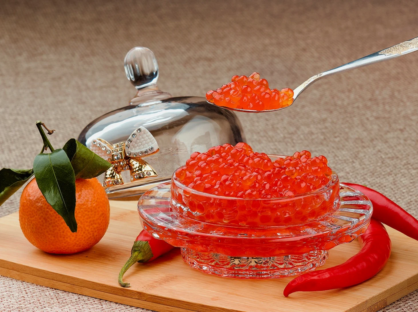 Красная икра, которую традиционно покупают на новогодние праздники, содержит много витамина A.. В икре горбуши, нерки, кеты, кижуча достаточное количество жиров, которые усиливают усвоение ретинола. В 100 граммах продукта в среднем содержится 450 мкг ретинола.