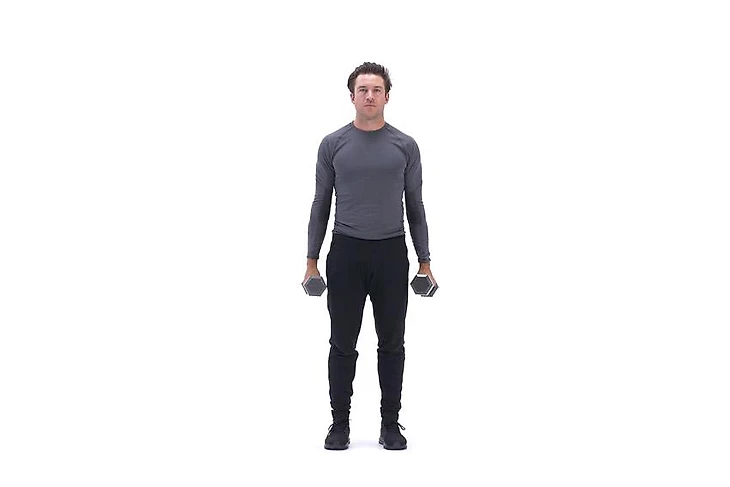 Подберите гантели с тяжелым весом. Чем труднее вам держать снаряд, тем больше эффект от упражнения. Встаньте ровно. Возьмите гантели в руки и просто стойте.