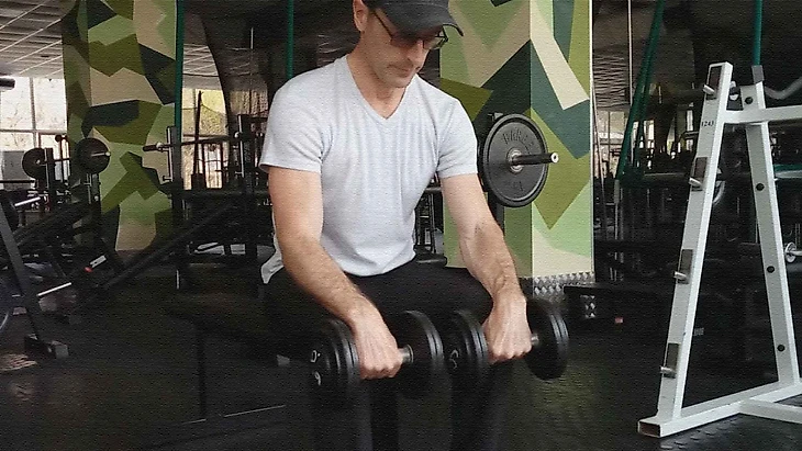 Возьмите гантели супинированным хватом (ладони направлены вверх) и расположите предплечья на ногах таким образом, чтобы кисти выходили за пределы колен. Важно поддерживать естественный прогиб в пояснице и прямое положение спины.