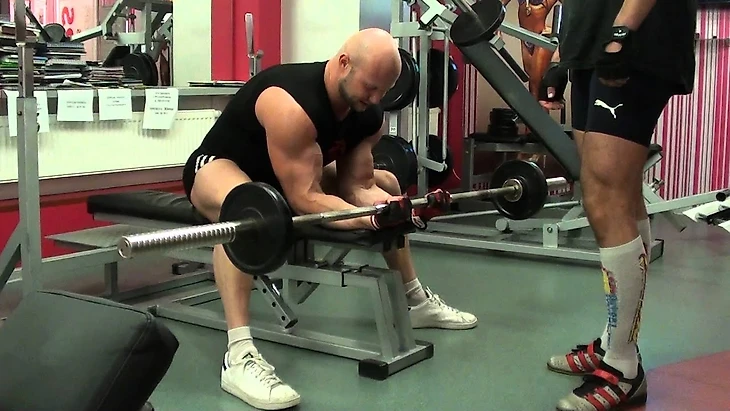 Руки разверните кистями вверх и попросите партнера подать вам штангу. Обратите внимание, что ваши запястья не должны упираться в поверхность. Они должны быть за ней. Кисти со штангой опустите к полу. Это исходное положение.