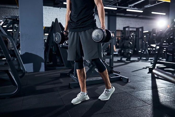 Возьмите в руки тяжелые гантели. Встаньте ровно, ноги чуть шире плеч, спина прямая, не сутультесь взгляд направлен вперед.