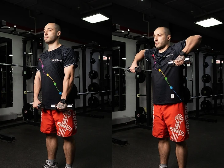 Не сгибайте руки в локтях и не помогайте себе спиной. В верхней точке сделайте небольшую паузу, максимально напрягая трапеции.