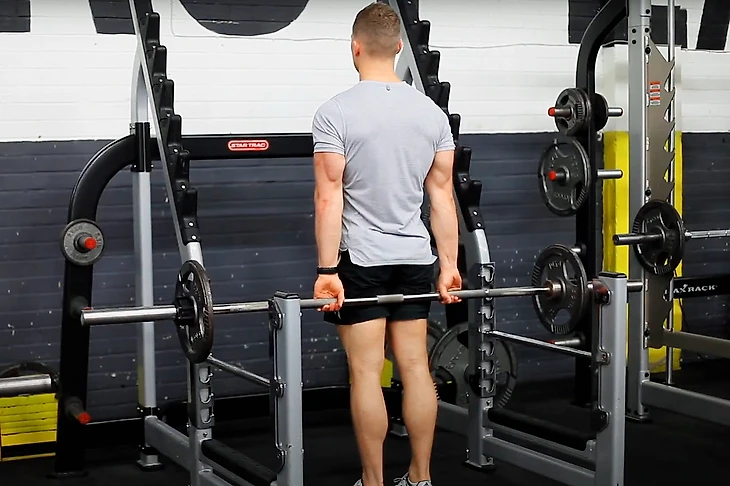 Возьмите штангу хватом сверху чуть шире плеч. Встаньте прямо, ноги на ширине плеч, спина прямая, взгляд направлен вперед. Напрягите кор, чтобы стабилизировать позвоночник.