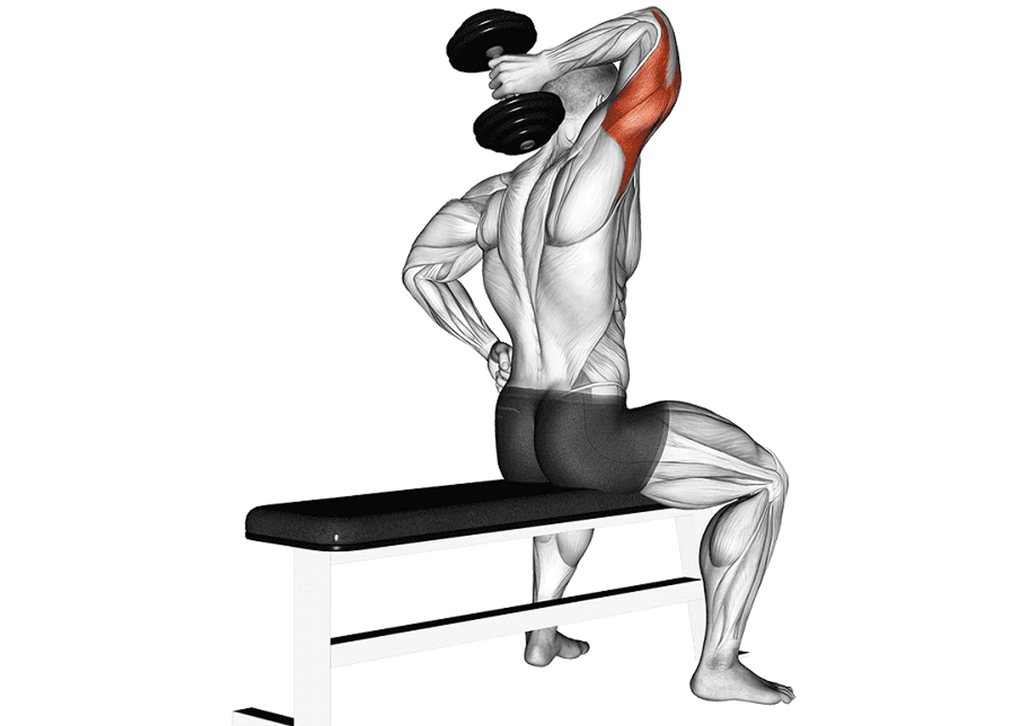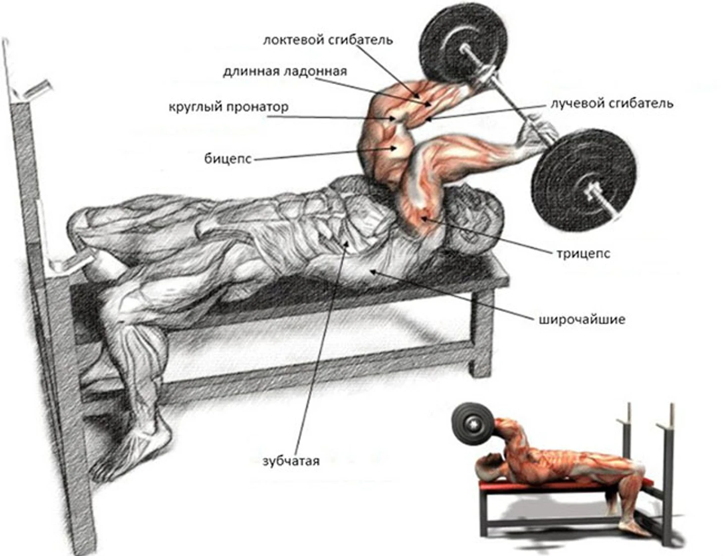 Основная нагрузка в французском жиме приходится на трицепс. Длинная головка активируется при отведении руки назад или поднятии ее над головой, латеральная головка отвечает за разгибание руки, а медиальная головка стабилизирует локоть в движении. В зависимости от варианта выполнения французского жима (лежа, сидя, стоя) и положения рук акцент нагрузки может смещаться на разные головки трицепса.