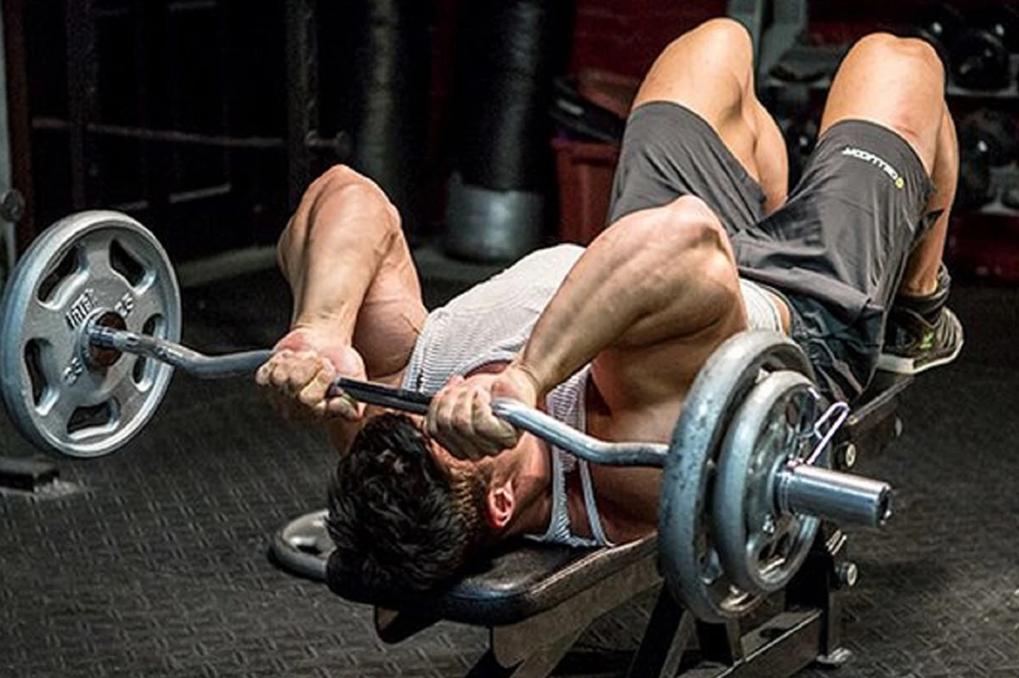 На наклонной скамье. Выполнение упражнения на скамье с положительным наклоном смещает акцент на длинную головку трицепса. Увеличивает амплитуду движения и растяжение мышц, но требует большей стабилизации корпуса.