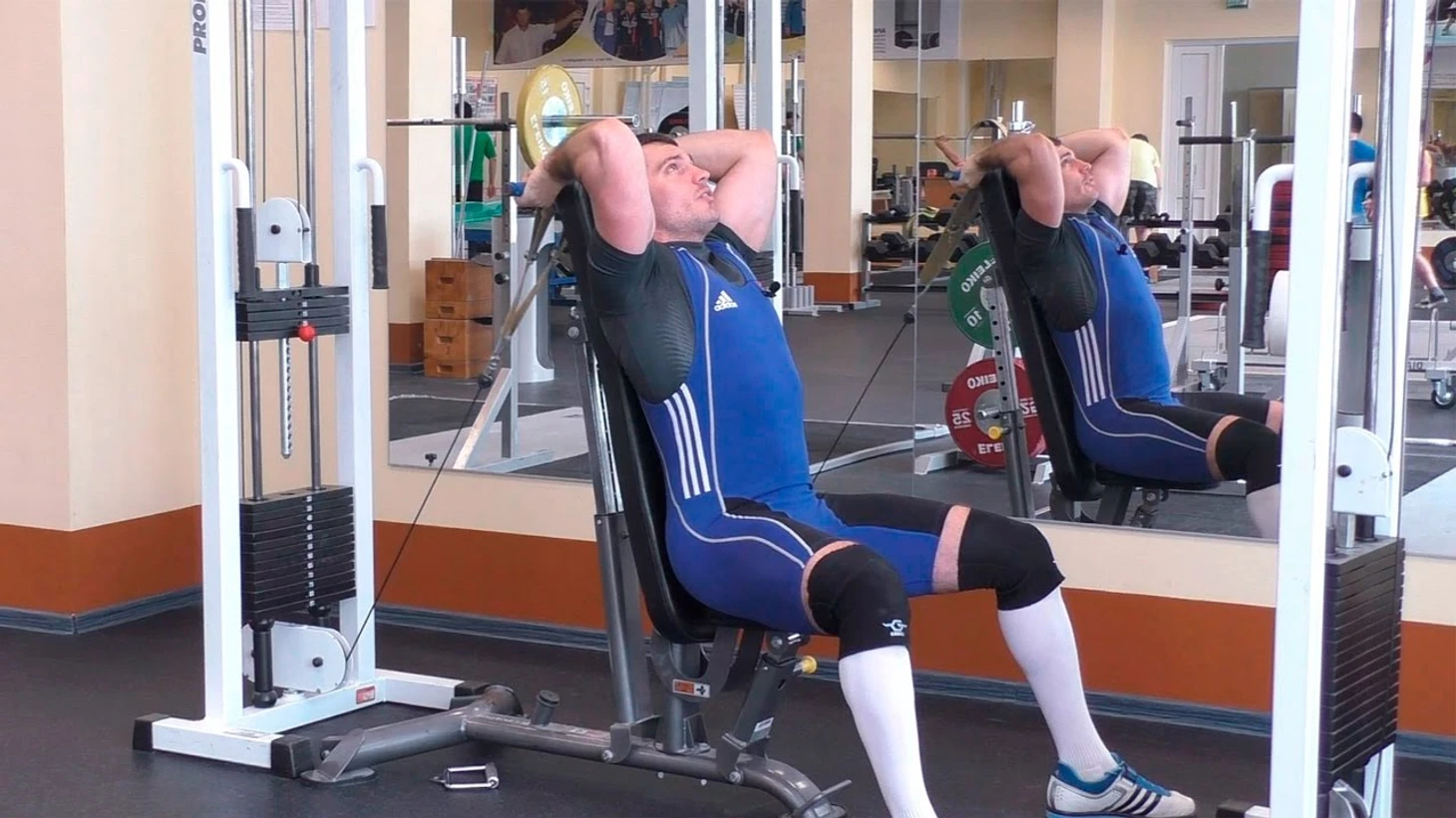 Расположитесь на скамье: лягте на горизонтальную скамью, плотно прижав спину и пятки к поверхности, чтобы не скользить.
