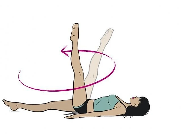 Упражнение выполняется лежа на спине, руки расположены вдоль тела ладонями вниз, ноги прямые. Если хотите не только размять таз, но и подкачать пресс, руки скрестите за головой. Поднимите одну ногу вверх, перпендикулярно полу. Начните выполнять круговые движения ногой в тазобедренном суставе: 10-15 раз по часовой стрелке, затем 10-15 раз против часовой стрелки. Выполняйте движения плавно, в комфортном диапазоне. Повторите упражнение другой ногой. Регулярное выполнение этого упражнения не только прорабатывает суставы, оно улучшает кровообращение в области таза, что благотворно влияет на состояние внутренних органов.