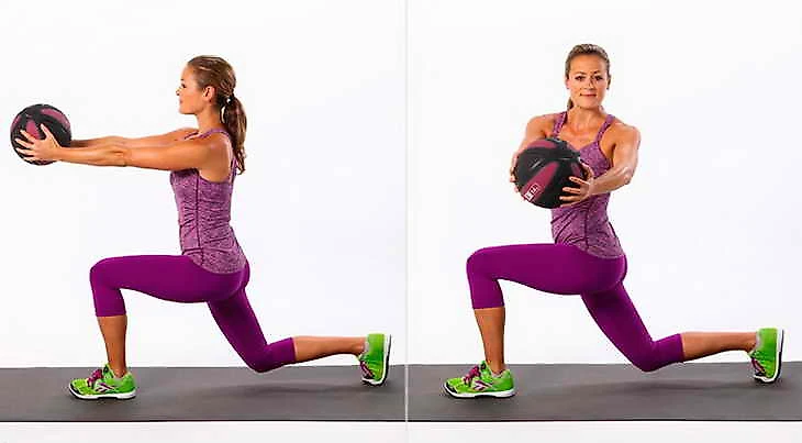 Представляет собой вариацию классических выпадов, дополненную элементом ротации корпуса. Встаньте ровно, после сделайте шаг вперед, например, правой ногой. Согните правую ногу в колене под прямым углом, левое колено приблизьте к полу, но не касайтесь его. Большая часть веса приходится на переднюю конечность. В нижней точке выполните поворот корпуса в сторону выставленной вперед ноги (в нашем случае – вправо). Вернитесь с начальную позицию и повторите движение с другой ноги. Рекомендуется выполнить 10-15 повторений с каждой стороны.