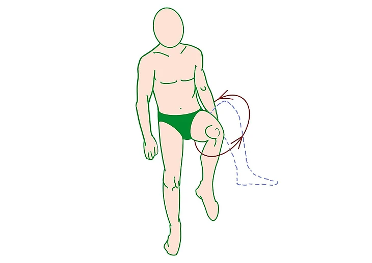 Встаньте ровно, ноги держите ширине плеч, спина прямая, взгляд направлен вперед. Руки можно поставить на пояс или произвольно опустить вдоль тела. Согните одну ногу в колене и поднимите ее вперед до уровня пояса. Представьте, что ваше бедро – это ось, вокруг которой вращается голень. Начните выполнять круговые движения ногой в тазобедренном суставе: сначала 10-15 раз по часовой стрелке, затем 10-15 раз против часовой стрелки. Следите, чтобы корпус оставался неподвижным. Чтобы не потерять равновесие, можно держаться рукой за опору.