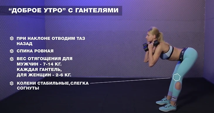 Начните движение с того, что отодвиньте таз назад, как будто хотите коснуться ягодицами стены за спиной. Одновременно наклоняйте корпус вперед, не сгибая спину. Гантели должны оставаться на месте. Вы должны ощущать растяжение в мышцах задней поверхности бедра и ягодицах. С помощью силы ягодичных мышц и бицепса бедра вернитесь в вертикальное положение. В конце движения дополнительно напрягите ягодицы.