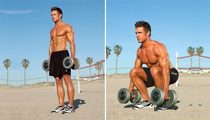 Движение хорошо качает мышцы задней поверхности тела, включая ягодицы, бицепс бедра и разгибатели спины. Меняя технику, вы можете сделать акцент на разные мышечные группы. Как правильно выполнять: встаньте, ноги на комфортном расстоянии друг от друга, примерно на ширине таза. Возьмите гантели и держите их около плеч. Спина прямая, лопатки приближены друг к другу, взгляд направлен прямо перед собой.
