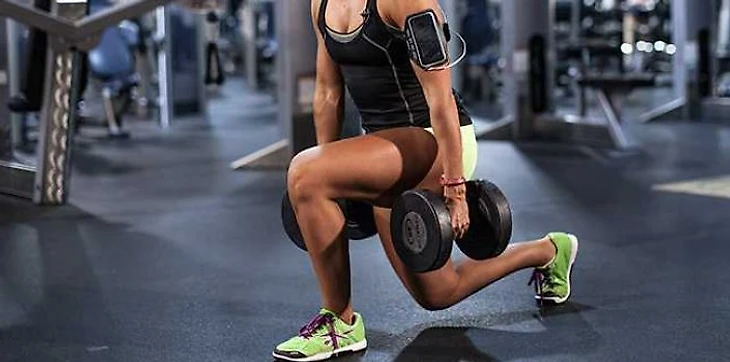 Возьмите гантели в руки и встаньте перед скамьей (или другой возвышенностью). Расстояние от скамьи должно быть таким, чтобы при выпаде ваше переднее колено не выходило за носок.