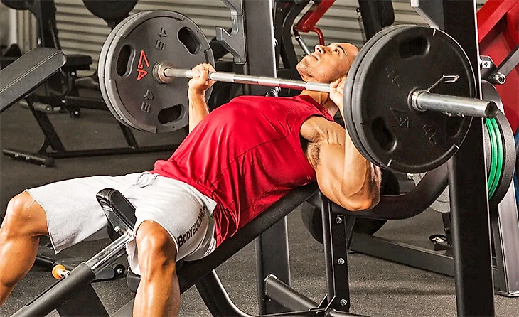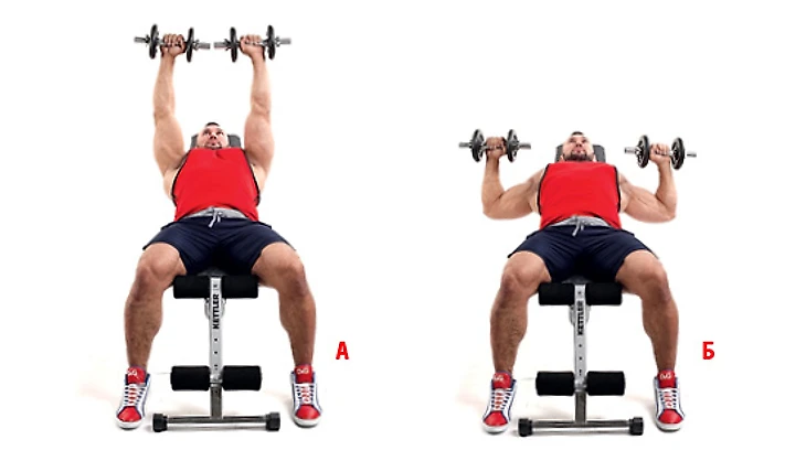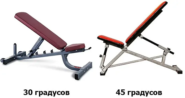 Наклон 30-45°: при увеличении угла акцент смещается на верхнюю часть большой грудной мышцы (ключичную часть). Это обусловлено изменением вектора силы, который направлен более вертикально, что требует большего участия волокон верхней части груди. Роль передних дельт также возрастает.