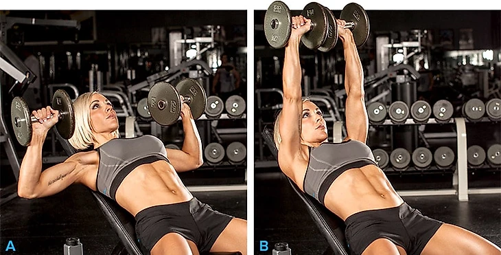 Установите скамью под желаемым углом. Расположите гантели по бокам скамьи на уровне плеч. Лягте на скамью, плотно прижав спину и ягодицы к поверхности. Стопы устойчиво поставьте на пол.