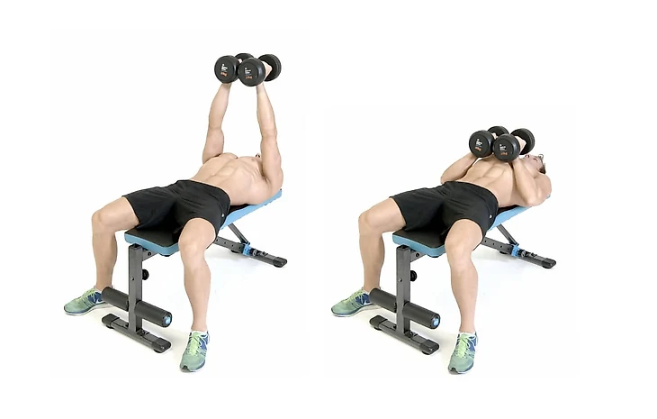 Лягте спиной на горизонтальную скамью, стопы уприте в пол. Возьмите гантели и поднимите их над собой. Локти должны быть согнуты, снаряды находятся близко друг к другу. На вдохе плавно опускайте вес, сгибая руки в локтях. Гантели должны оказаться максимально близко к груди. Вернитесь в начальную позицию и повторите движение еще 11-14 раз. Работа с гантелями требует большей стабилизации и координации, что способствует более эффективной проработке мускулов.