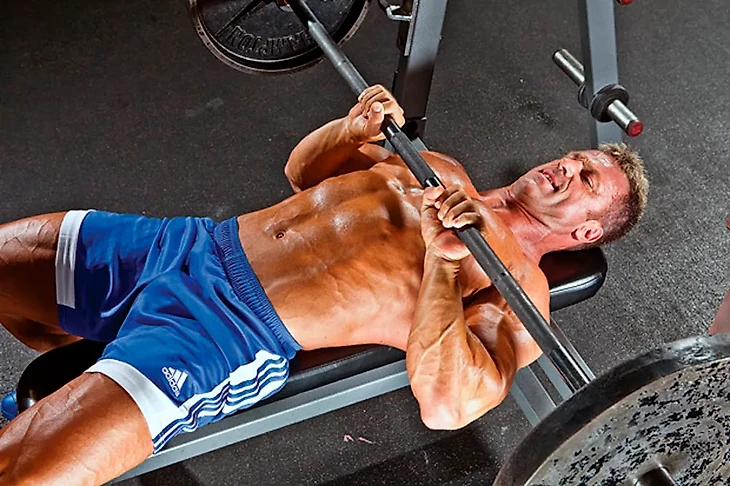 Классический жим узким хватом лежа на горизонтальной скамье: базовый вариант упражнения, при котором гриф опускается на грудь.