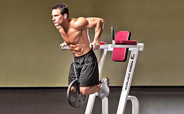 Встаньте на тренажер, удерживая тело на выпрямленных руках. Кисти рук расположите близко друг к другу, захватывая брусья прямым хватом (ладони направлены друг к другу). Тело должно быть перпендикулярно полу, ноги можно слегка согнуть в коленях для удобства. Прикрепите отягощение к поясу с помощью специального пояса или цепей.