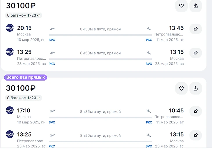 Полет на Камчатку являются основным способом добраться до региона, ведь она располагается далеко от центральной части России. Тариф авиабилетов из Москвы в Петропавловск-Камчатский зависит от сезона и перевозчика. В низкий сезон (осень или весна) тарифы стартуют от 25 до 35 тыс. руб. в оба конца. Летом, когда спрос возрастает, оплата может превышать 50 тыс. руб. Например, на март 2025 года при покупке в ноябре 2024 года цена билета в обе стороны на 1 человека выходит 30 тыс. руб. с багажом в 23 кг.