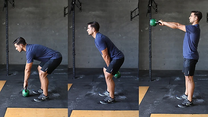 Возьмитесь за дужку гири прямым хватом. Опустите плечи и сведите лопатки, активируя широчайшие мышцы спины. Напрягите мышцы кора, чтобы стабилизировать корпус. Плавно поднимите гирю от пола, инициируя движение тазобедренным суставом. Заведите гирю назад между ног, сохраняя спину прямой. Колени при этом слегка сгибаются, но основное движение происходит за счет разгибания в тазобедренном суставе.