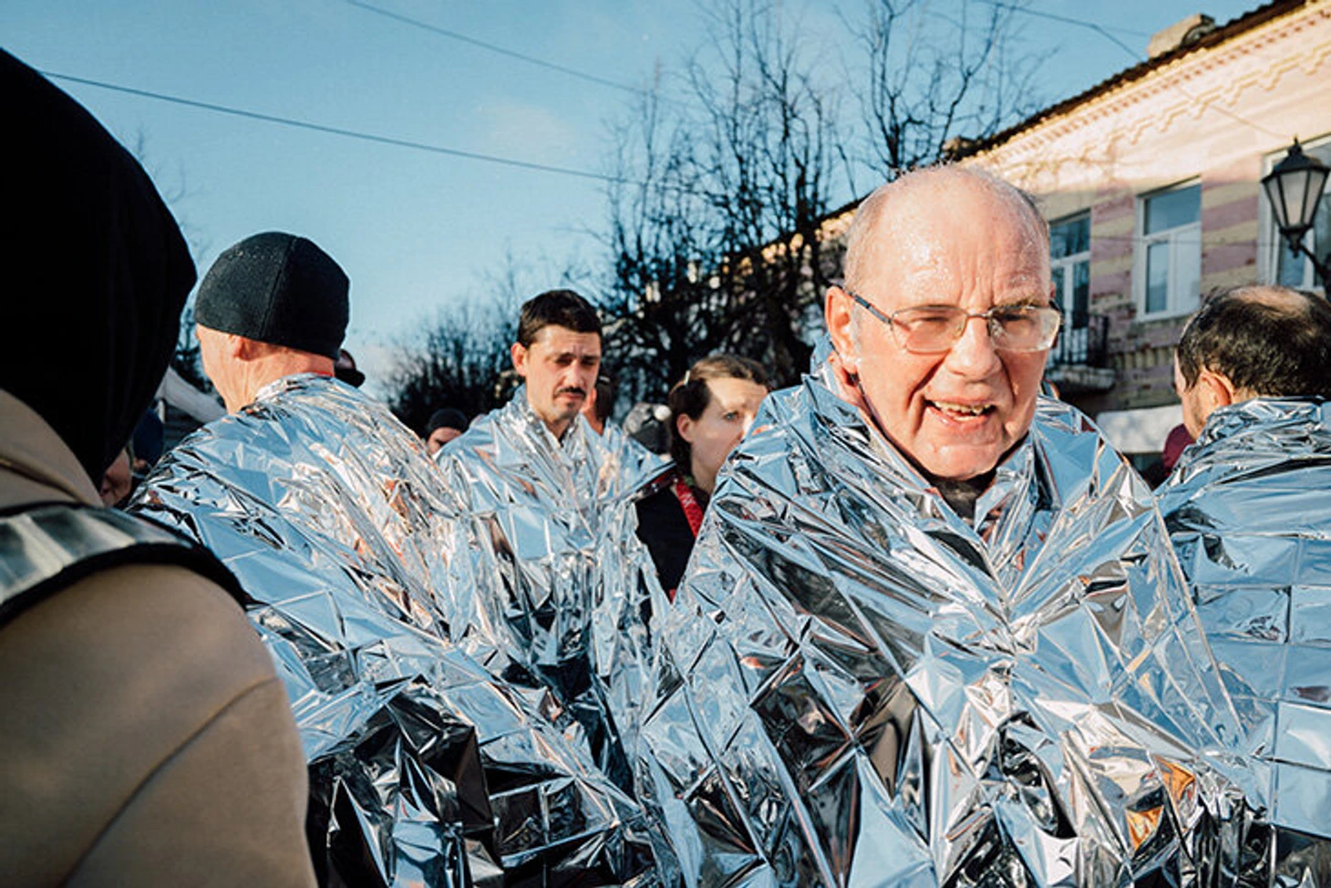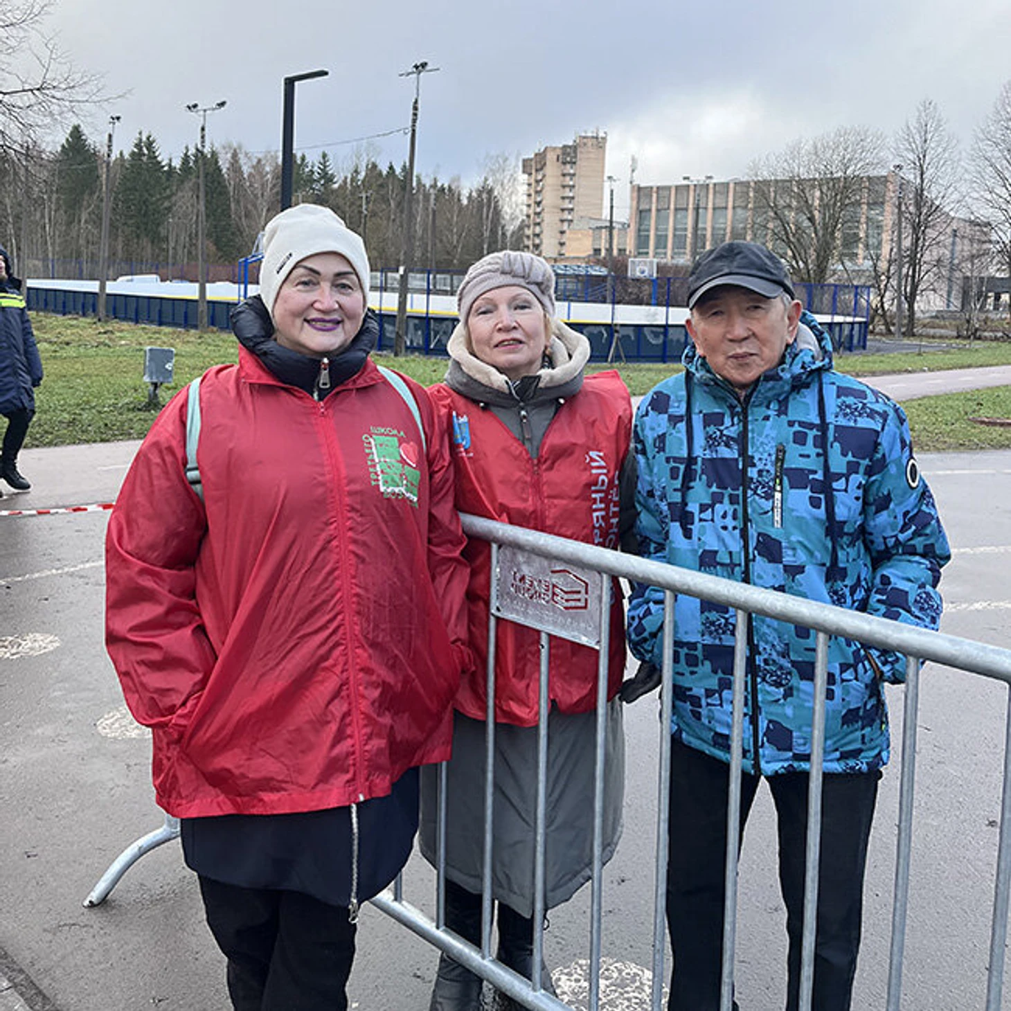 К Галине присоединились Людмила и Ким. Вообще из «Школы третьего возраста» пришло 13 человек на поддержку бегунов, многие из них грелись в соседнем здании и пили чай, так как стояли на точке с 10 до 14 часов. «Первых [дистанция 10 км] мы уже встретили, подбадривали, танцевали, пели, кричали», – рассказывала Людмила. Поверх пуховика на ней жилетка с надписью «Серебряный волонтер» – такие выдают волонтерам старше 55 лет. Пенсионерка выходит на поддержку несколько лет. На вопрос, почему в Гатчине так поддерживают полумарафонцев, Людмила ответила: «Это заразительно очень. Во всем мире сейчас молодежь бегает. Это всем интересно». Ким, единственный мужчина в компании, отметил, что в Гатчине чище воздух, поэтому и бежится лучше.