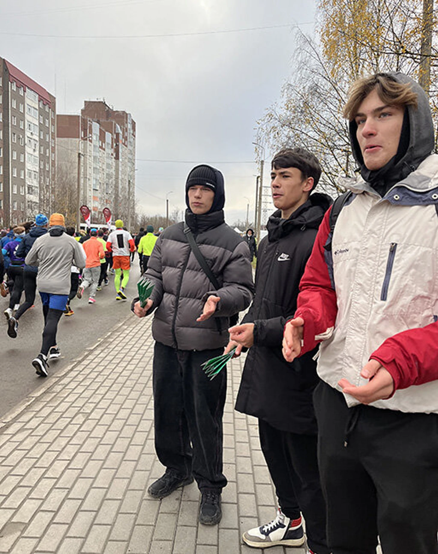На этой же улице стояли студенты первого курса Гатчинского педагогического колледжа – пять человек. Даша была волонтером уже два раза, в этот раз пришла с подругой Олесей. У них только хлопушки, нет громкоговорителей, поэтому они кричат во весь голос: «Вперед, вперед!». Немного поодаль стоят парни из этого же колледжа. Даниил рассказывает, что они пришли поболеть за знакомых бегунов. Первокурсники удивляют. Пришли одни, без преподавателей, не за зачет. Точку поддержки захотели сделать сами, колледж подал заявку на создание официального места боления.