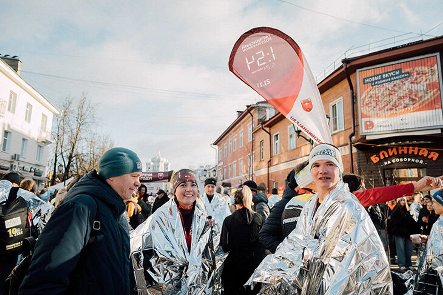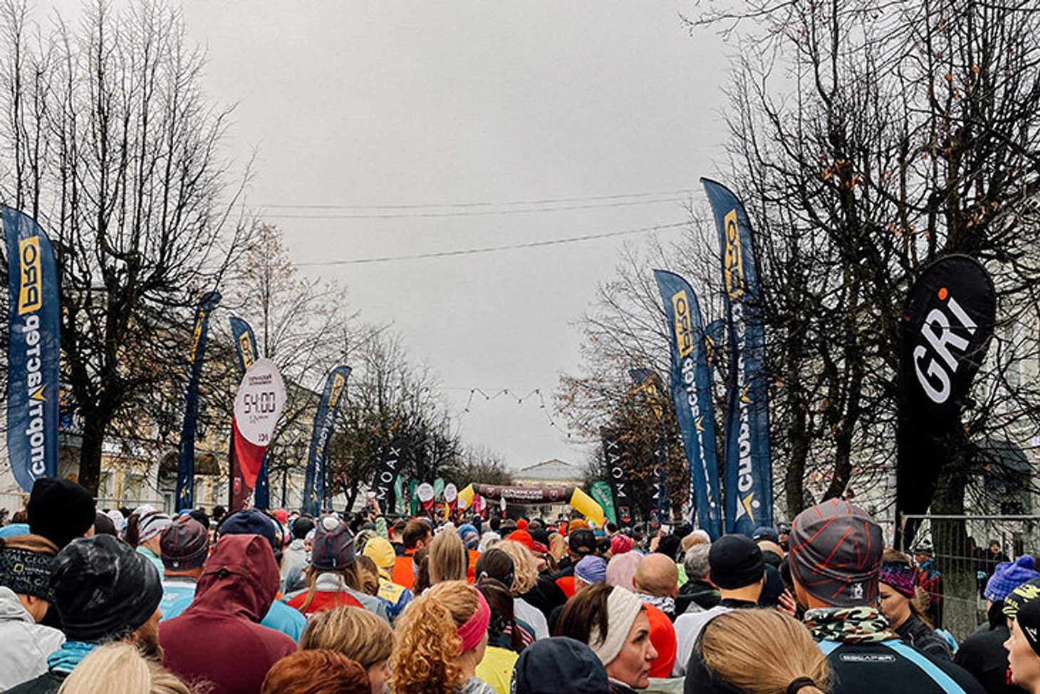 Стартово-финишный городок не очень большой, он находится на пересечении центральных улиц – Соборной и Красной. Болельщикам, наблюдающим за стартом, открывается вид на Собор Святого Апостола Павла, с которого недавно сняли строительные леса после реставрации. Этот старейший храм – один из символов города, который также изображен на медали забега.