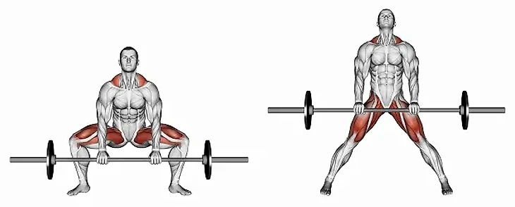 Квадрицепсы, приводящие мышцы бедра и ягодичные мышцы выполняют основную работу по подъему веса. Широкая постановка ног сокращает амплитуду движения, позволяя работать с большим весом, но требует хорошей растяжки и мобильности тазобедренных суставов.