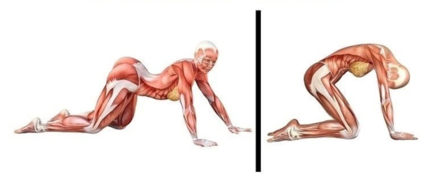 На выдохе позвоночник выгибается вверх, подбородок прижимается к груди, мышцы живота напрягаются, копчик подкручивается внутрь.