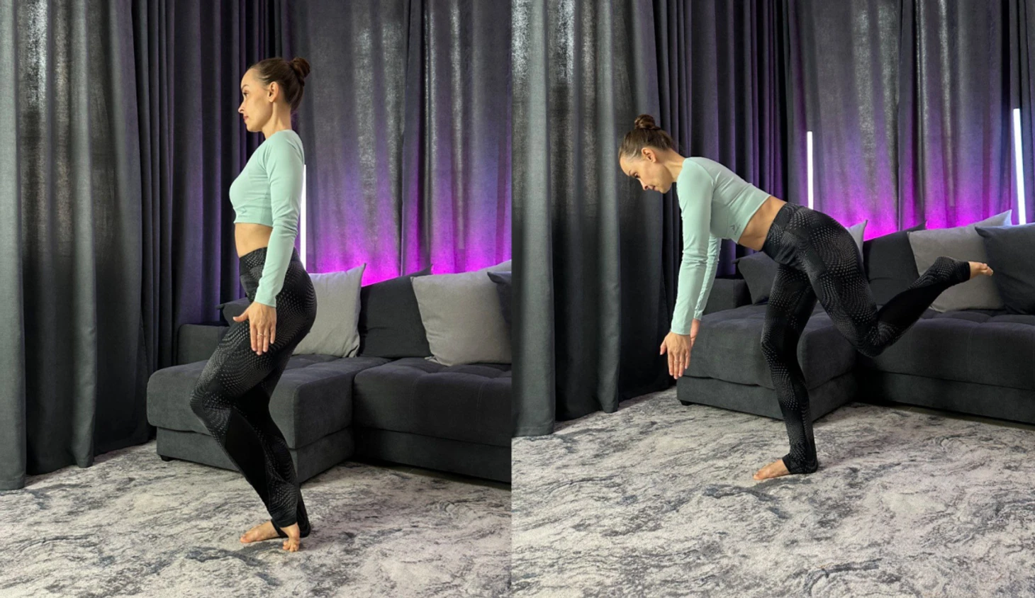 Перенесите вес тела на опорную ногу, слегка согнув колено. Вторая нога выпрямляется и поднимается назад.