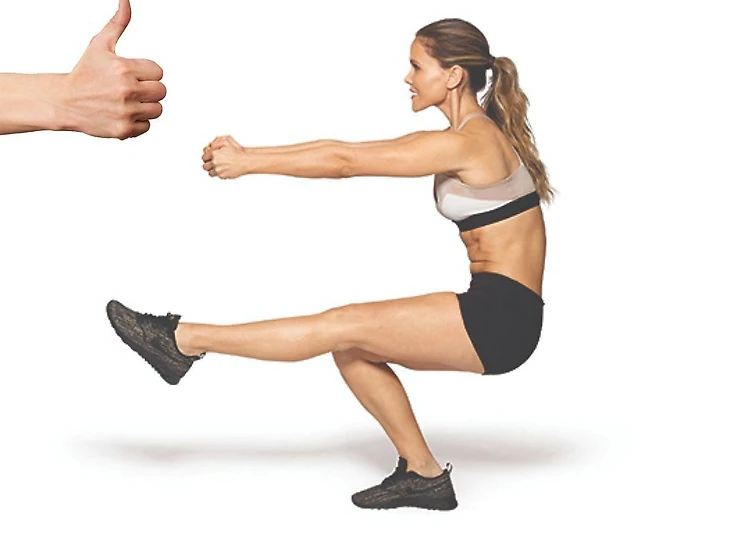 Неполный «пистолетик»: 3 подхода по 10-12 повторений на ногу. Встаньте спиной к стулу, поднимите одну ногу и медленно опуститесь на стул. Держите спину прямо, колено опорной ноги не заворачивайте внутрь, пятку не отрывайте от пола.