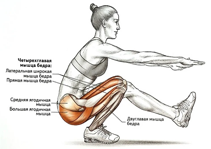 Глубина приседа варьируется от параллели бедра с полом до более низкого положения, увеличивая нагрузку и эффективность упражнения.