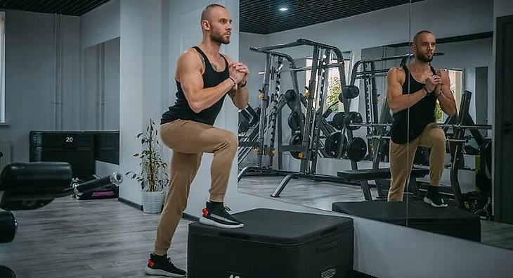 Зашагивания на возвышение: 3 подхода по 10 подъемов на каждую ногу. Используйте устойчивую опору высотой 30-50 см. Поднимайтесь, держа спину прямо, не заворачивая колено опорной ноги внутрь. Не отталкивайтесь от пола опорной ногой.
