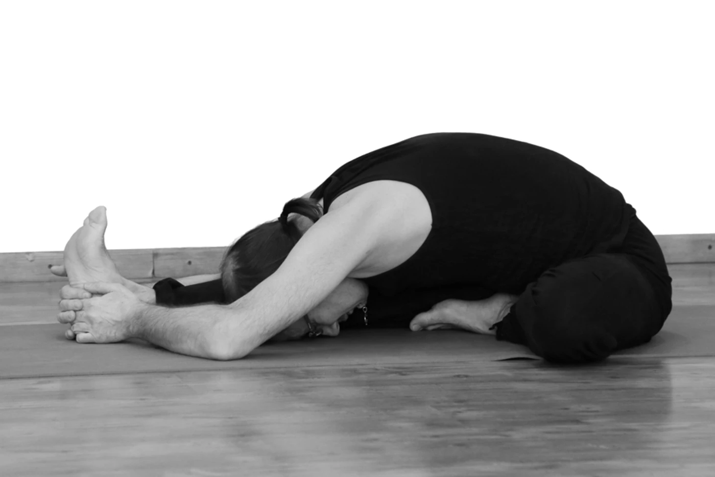 Джану Ширшасана – растягивает заднюю поверхность бедра, икры, квадрицепсы и мышцы паха. Сядьте на пол, вытянув ноги вперед. Согните правую ногу в колене и расположите стопу у внутренней поверхности левого бедра. Левая нога остается прямой или слегка согнутой в колене. На выдохе наклонитесь вперед, стремясь головой к левому колену. Задержитесь в этом положении на 10 дыхательных циклов, затем повторите упражнение на другую сторону. Для более глубокого растяжения можно использовать ремень, обхватив им стопу вытянутой ноги.