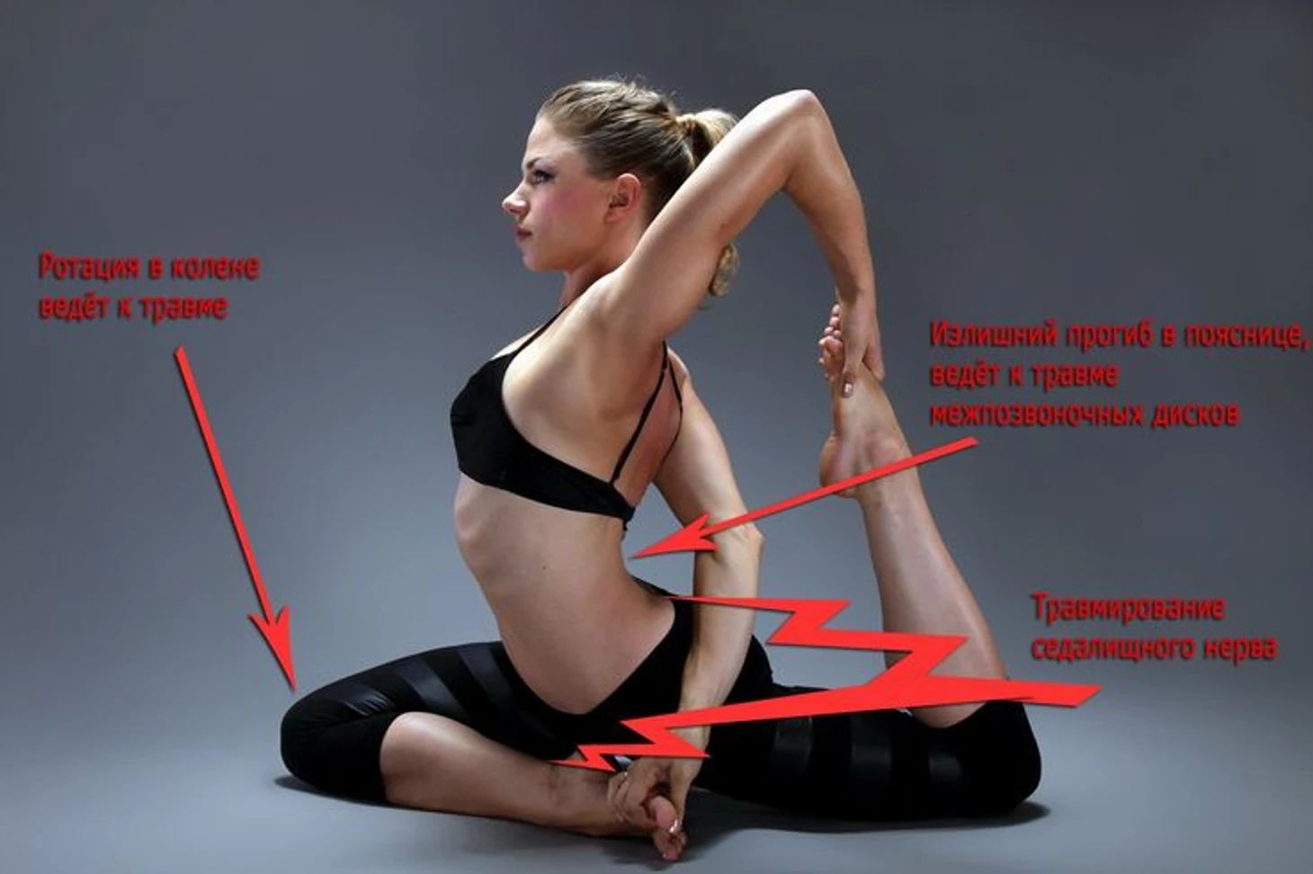Чрезмерное напряжение в коленях. Если в коленях возникает дискомфорт или боль, следует уменьшить интенсивность растяжки или использовать дополнительные поддержки (например, одеяло под колено согнутой ноги).