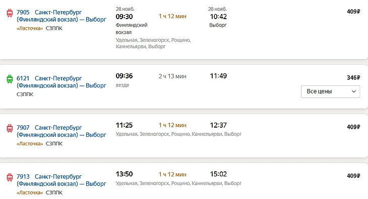 Помимо пригородных электричек, транспортное сообщение между СПб и Выборгом обеспечивают скоростные электропоезда «Ласточка». Они отправляются с Финляндского вокзала несколько раз в день, начиная с раннего утра и заканчивая поздним вечером. Например, электричка № 7901 уходит в 07:55, № 7905 — в 09:30, а последний рейс, № 7917, — в 20:47. Поездка длится всего 1 час 12 минут.