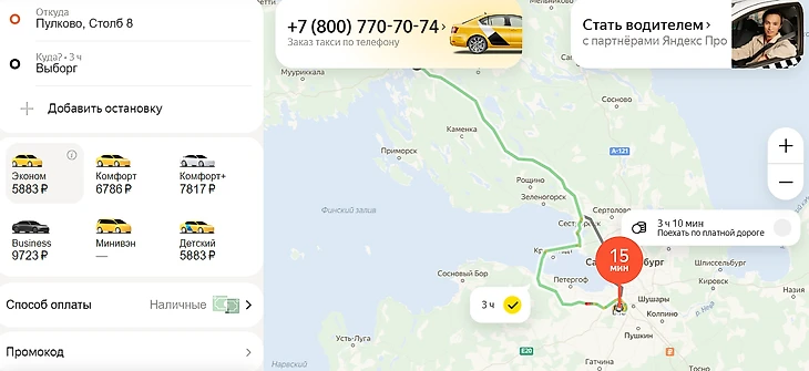 Заказать машину можно в любое время, у большинства популярных перевозчиков есть специальный тариф «Межгород». Оплата производится онлайн, фиксированная стоимость гарантирует отсутствие дополнительных расходов и неприятных сюрпризов. Стоимость такси из Санкт-Петербурга в Выборг начинается от 5800 рублей. Если ехать на такси из МСК, придется потратить не менее 17 тысяч рублей.