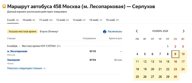 Автобусы следуют по маршруту каждый день, с интервалом в 15 минут. Первый рейс из Москвы отправляется в 07:00 или 07:15, а последний – в 23:30 или 23:00. В часы пик возможно одновременное отправление двух или даже трех автобусов. На территории Чехова предусмотрены остановки в таких точках, как «Сквер им. Чехова», «Магазин», «Восход», «Завод Регенератный», «Завод Гидросталь», «Школа № 2» и «Станция Чехов». Отправление автобусов обратно в Москву начинается в 05:30 и завершается в 21:30, с интервалом в 10 минут. Следует отметить, что некоторые рейсы могут выполняться не ежедневно, а лишь в определенные дни, например, в будние.