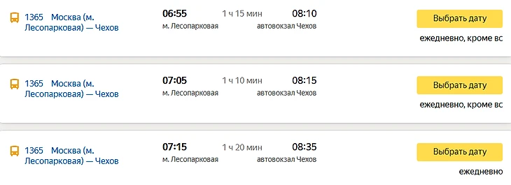 «Москва (м. Лесопарковая) – Серпухов» также проходит через Чехов и может служить альтернативным вариантом. Автобусы отправляются с платформы № 8 станции метро «Лесопарковая» с 07:15 до 23:15, с интервалом от 15 до 30 минут. В обратном направлении, от остановки «Сквер имени Чехова», движение начинается с 05:42 и продолжается до 21:42. Трасса маршрута проходит по М2, а время в пути до Чехова занимает примерно от 35 до 60 минут.