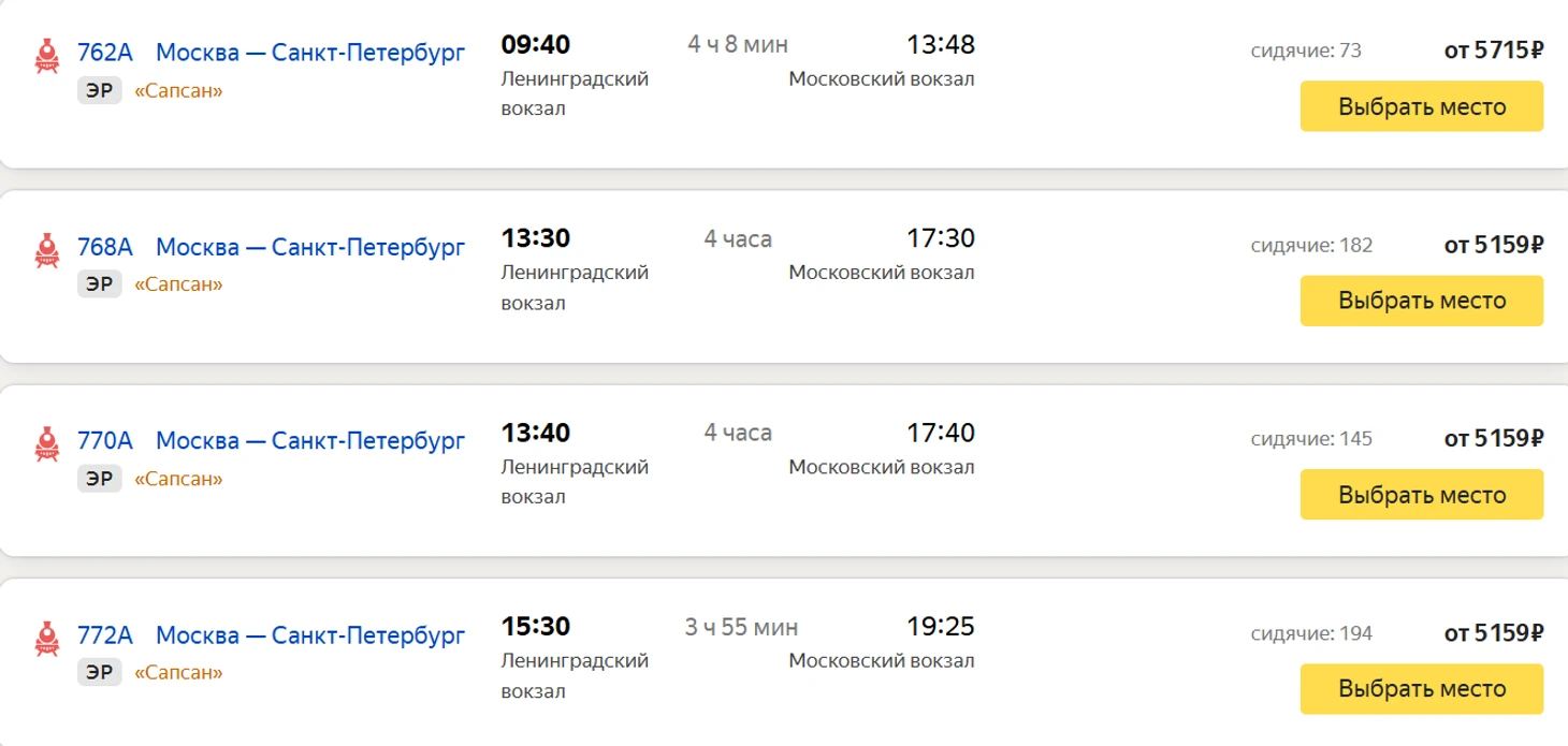 «Сапсан» наиболее выгодный вариант доехать от Москвы до Питера быстро по железной дороге. В среднем каждый рейс тратит на дорогу четыре часа, разница между ними в нескольких минутах. Правда, стоимость билетов при этом не самая дешевая, что ожидаемо, и стартует от 3 816 рублей.