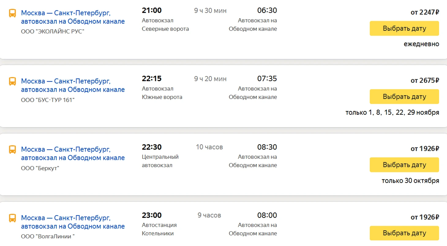 Ежедневно в Санкт-Петербург из столицы отправляются автобусы со следующих автостанций: