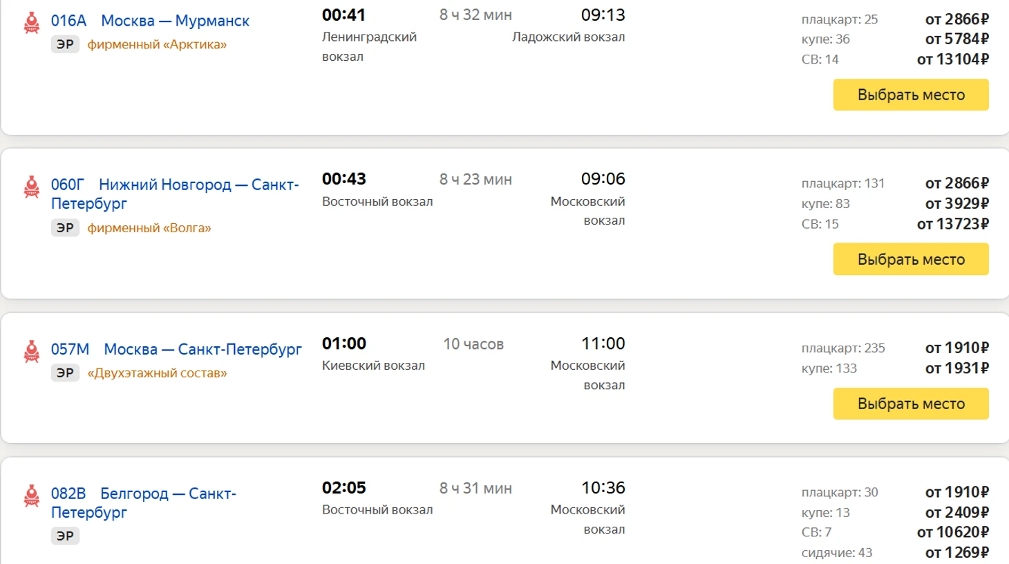 Еще одна категория поездов предоставляет регулярное сообщение. Для части из них конечная станция Санкт-Петербург, другая часть проходящие через город на Неве. В некоторых случаях можно приобрести билет на сидячие места, который будет стоить до полутора тысяч рублей. Только такой вариант доехать до Питера из Москвы дешево на поезде. Во всех остальных стоимость билетов дороже. Обычно туристы предпочитают приобретать билеты на поезда, которые отправляются вечером, проводят ночь в дороге и рано утром оказываются в Северной столице.
