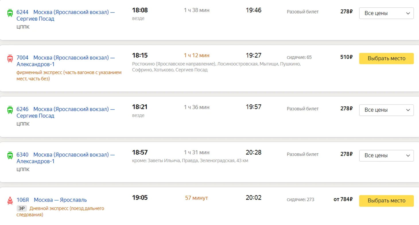 С остановкой в Сергиевом Посаде отправляются поезда двух сообщений: 102Я, 104Я и 106Я «Москва – Ярославль» и 108Я «Москва – Вологда». Стоимость билетов на первый составляет от 784 рублей в вагоны с сидячими местами и 3 474 рубля в купе. Поезд отправляется в 07:35, 14:45 и 19:05 по московскому времени. Время в пути — 57 минут.