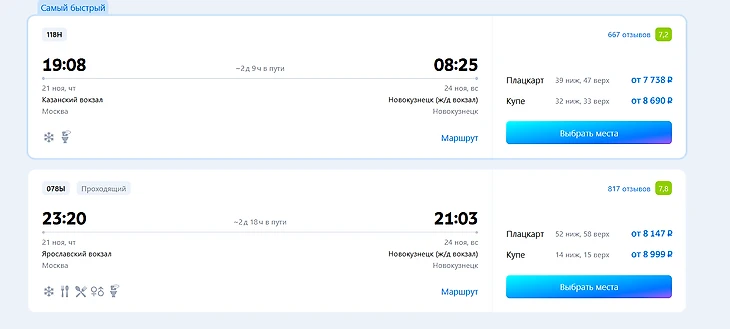 Цена билета на поезд из Москвы в Новокузнецк или Новосибирск зависит от класса обслуживания и времени покупки: