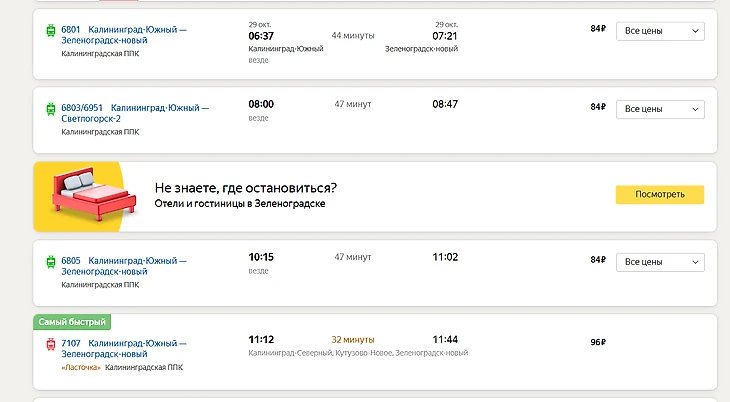 Кроме электричек в направлении Зеленоградска из Калининграда также ходят пригородные поезда. Они также отправляются с Южного вокзала и предлагают комфортное путешествие с аналогичным временем в пути — около 35-40 минут. Однако расписание пригородных поездов не такое частое, как у электричек, и их рейсы можно подобрать заранее по расписанию.