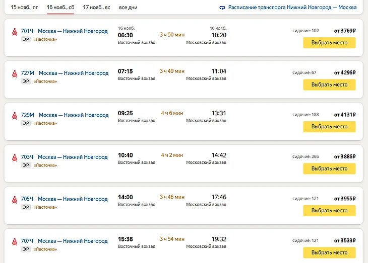 Расписание поездов до Нижнего Новгорода можно посмотреть на сервисе Яндекс Расписания. Там на выбранную дату поездки можно посмотреть все рейсы поездов, в том числе и скоростные. Если нажать на номер и название рейса, то откроется маршрут следования поезда и время остановок на станциях по пути к Нижнему. На этом сервисе можно выбрать свободные места и приобрести билет себе онлайн, а для этого нужно нажать на «Выбрать место».