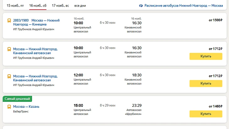 А вот самый дешевый вариант со стоимостью около 1500 рублей — это отправиться на рейсе Москва-Казань в 15:00 с Центрального московского автовокзала. Но при этом добираться на нем до Нижнего дольше всего: около 8.5 часов.