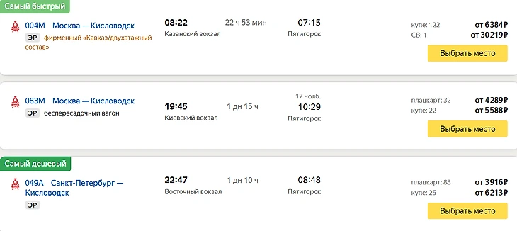 В 22:47 часов с Восточного вокзала Москвы в Пятигорск отправляется проходящий поезд обычного пассажирского сообщения из Санкт-Петербурга. В данном случае самые дешевые билеты — около четырех тысяч рублей в плацкартный вагон, но и время в пути составит около полутора суток. Еще один поезд сообщением Нижний Новгород – Кисловодск отправляется из Москвы в 01:50 с Казанского вокзала, но только по нечетным дням. В любом случае, если не купить билет на фирменный поезд, на котором доехать можно быстрее остальных, нужно настраиваться на длительную дорогу, как минимум, один день и восемь часов.