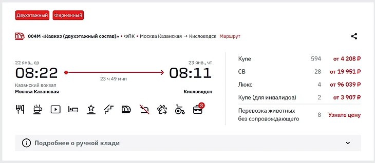 Цены на билеты зависят от типа вагона. В среднем плацкартные места стоят от 3 000 рублей, купейные – около 4 000-5 000 рублей, а места в СВ могут стоить от 15 000 рублей. Стоимость меняется в зависимости от времени года и спроса, так как РЖД применяет динамическое ценообразование.