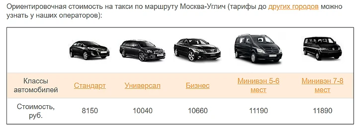 Цена трансфера из Москвы в Углич также зависят от класса и размера автомобиля, обычно она составляет от 7 000 до 12 000 рублей за машину. Этот вариант удобен тем, что вам не нужно беспокоиться о поиске автомобиля, особенно если прибытие запланировано на позднее время. Водитель встретит вас в указанное время и доставит прямо к месту назначения.